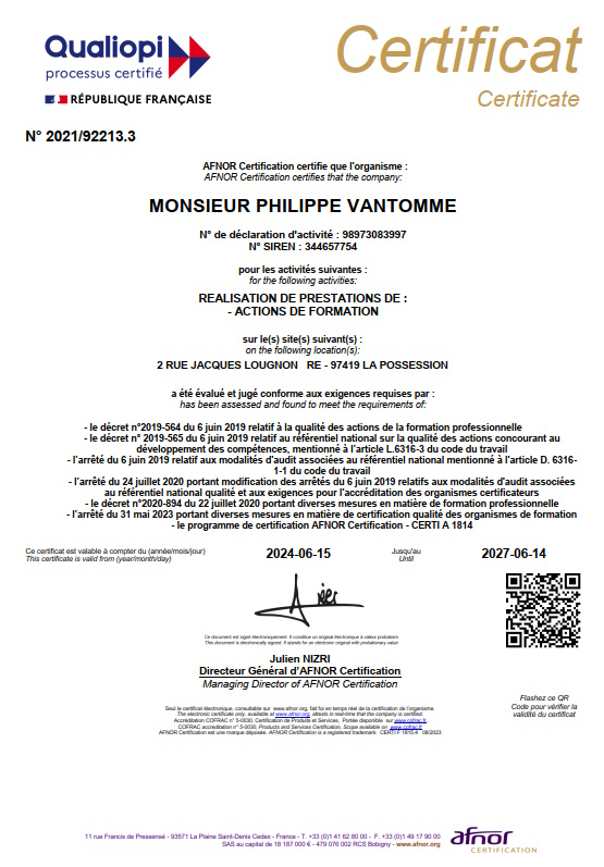 Vantomme Philippe FP2Srun . Formateur consultant en Sécurité et Conditions de travail à La Réunion.
